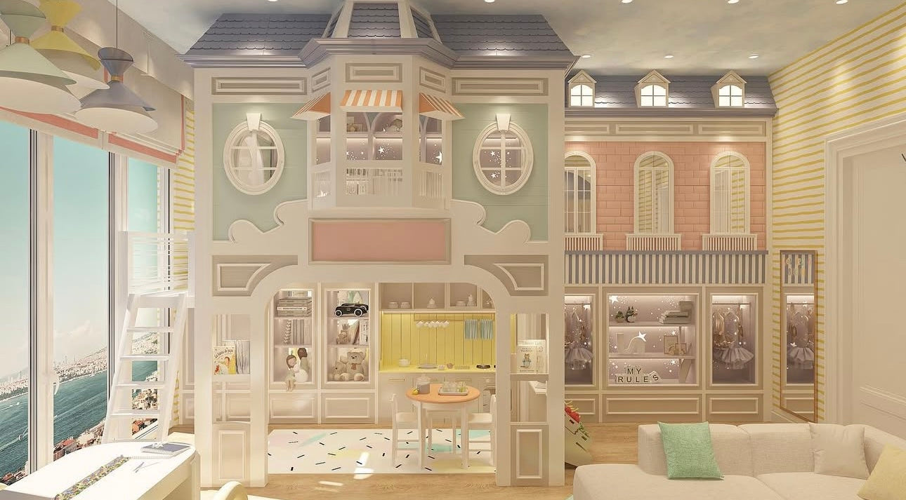 An architectural playhouse that unfolds into real rooms—complete with corridors, balconies, and private spaces—transforming a child’s bedroom into an entire world of their own.